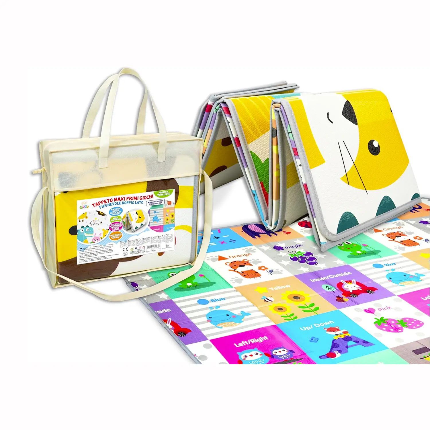 Tappeto educativo double face: - Un lato con alfabeto illustrato dalla A alla Z, l’altro con numeri da 1 a 10 e simpatici animaletti per imparare giocando.