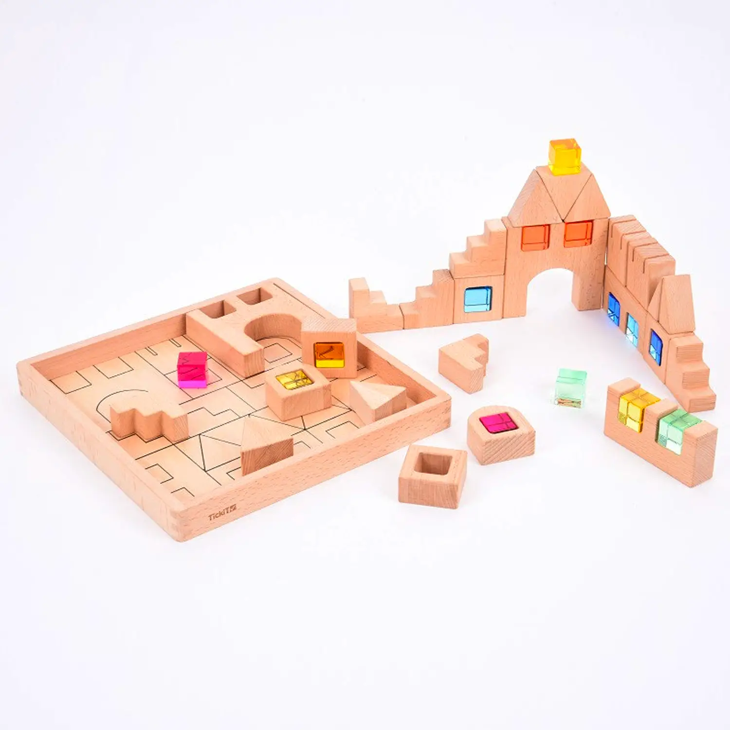 - ✅ 39 elementi creativi: blocchi in legno e cubi traslucenti colorati.