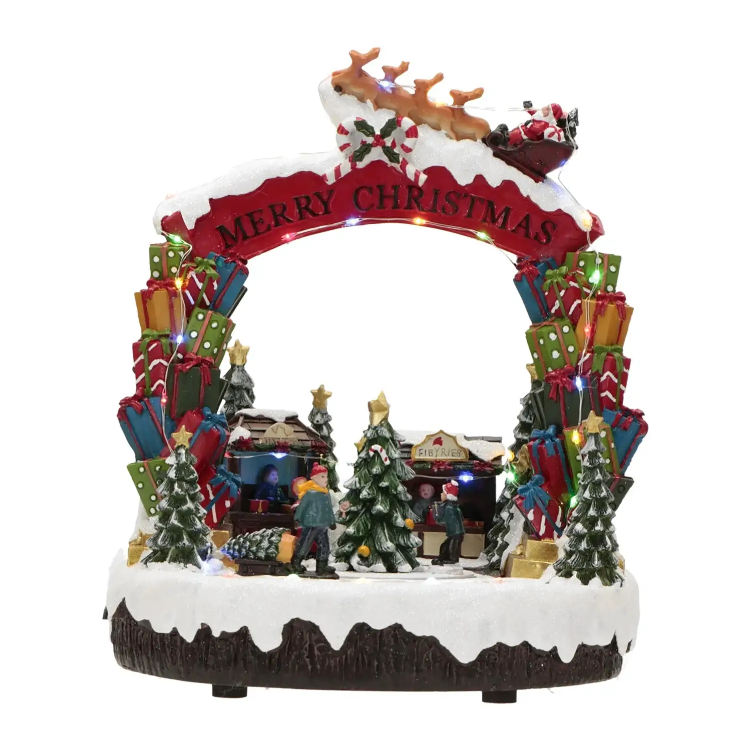 Design Ricco di Dettagli Con pacchi regalo giganti, alberi innevati, mercatini e la slitta di Babbo Natale, ogni elemento è pensato per sorprendere e incantare. Il tutto è sormontato da un elegante arco con scritta “Merry Christmas”.