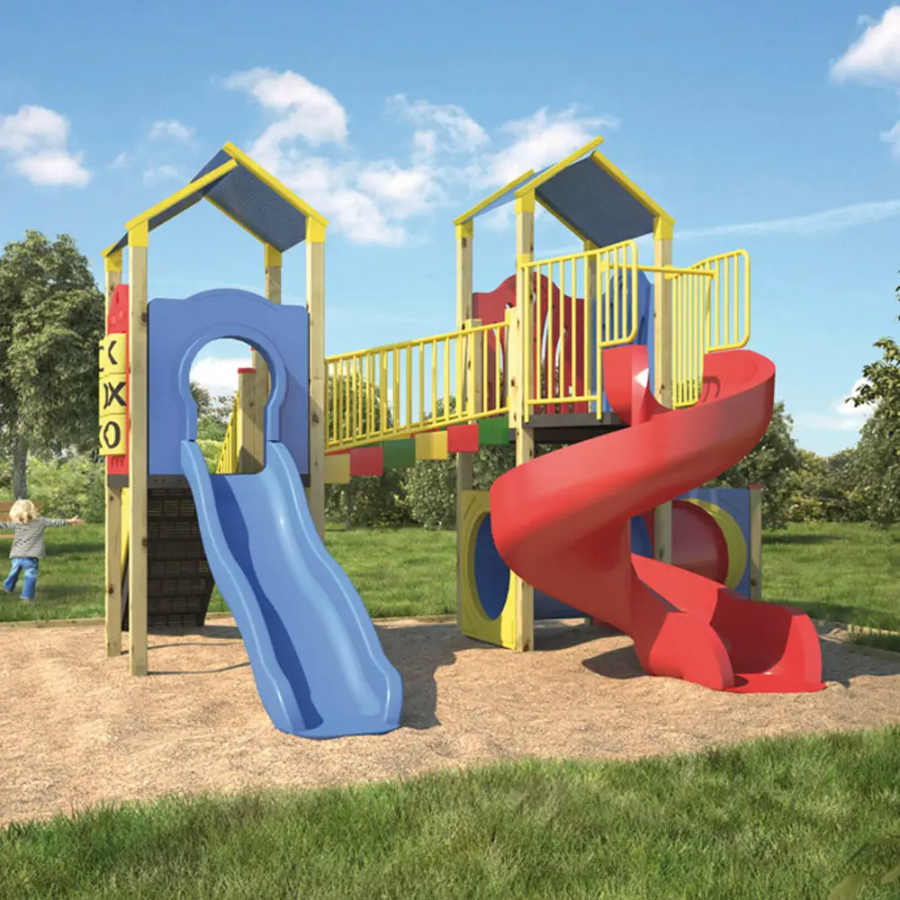 - Componenti: 2 torri, passaggio fisso, scala con balaustre, scivolo elicoidale, scivolo tunnel