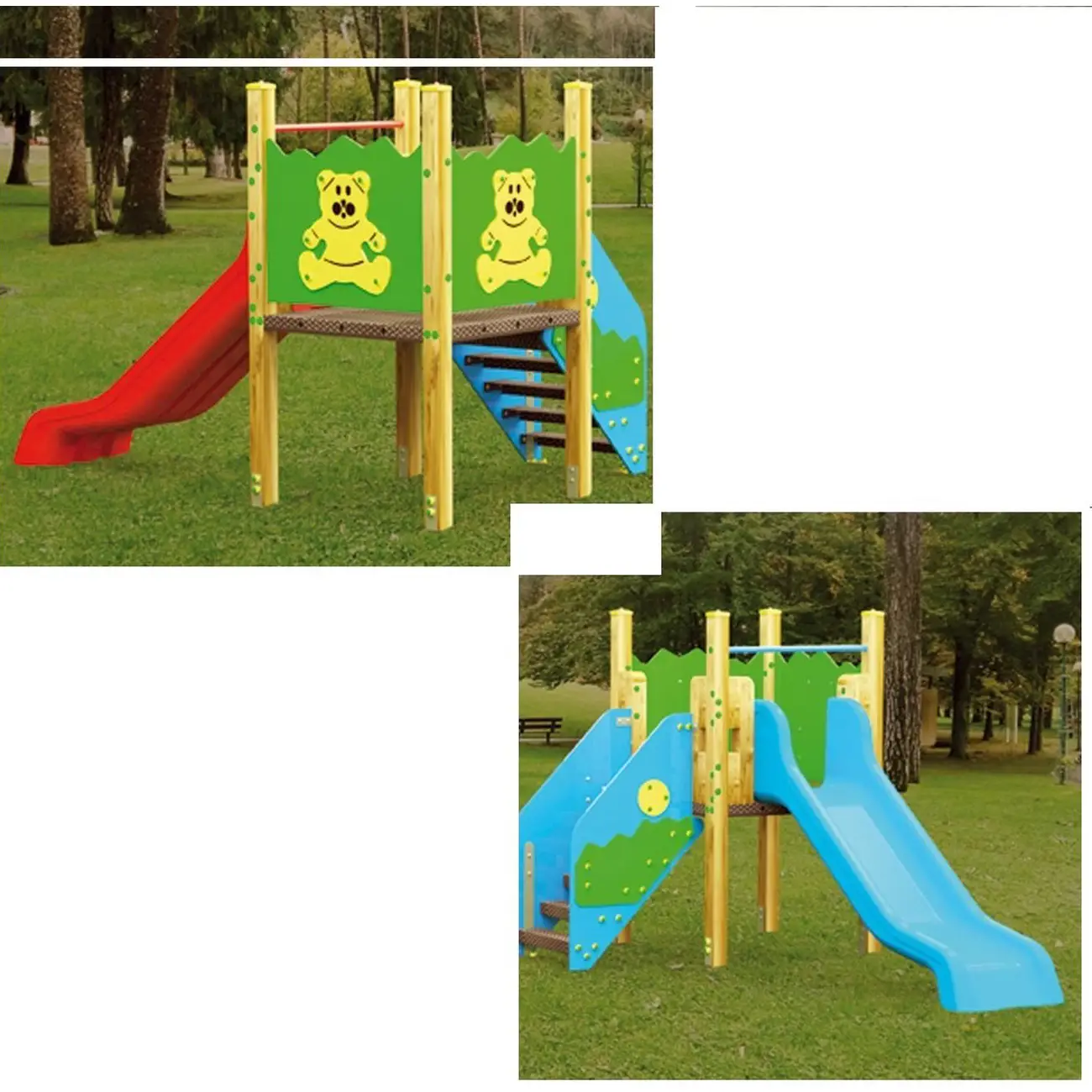 - Materiali: legno lamellare, multistrato, acciaio zincato, polietilene UV resistente