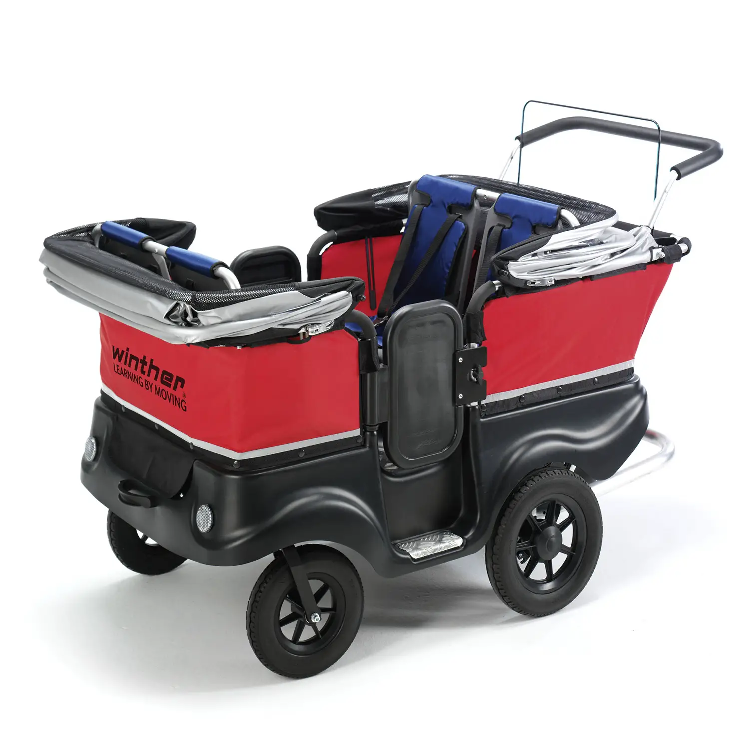 Il Kiddy Bus Deluxe 4 Posti è perfetto per chi cerca un passeggino multiplo sicuro, maneggevole e resistente, ideale per scuole, asili o passeggiate di gruppo.
