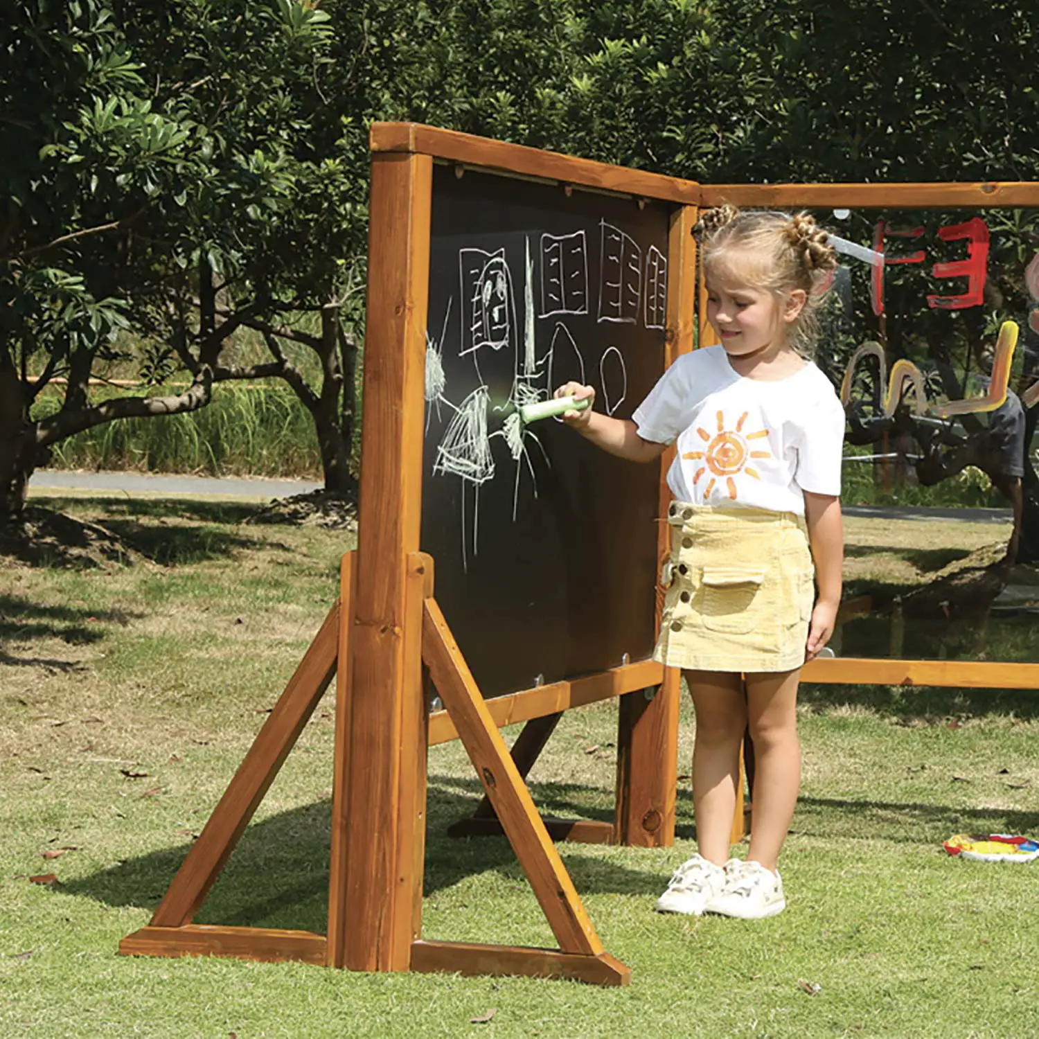 Versatile e Resistente: Questa grande lavagna bifacciale, realizzata in HPL tipo ardesia, permette ai bambini di esprimere la loro creatività all’aria aperta. Perfetta per scrivere o disegnare con gessetti colorati, è resistente alle intemperie e facile da pulire, utilizzabile su entrambi i lati.